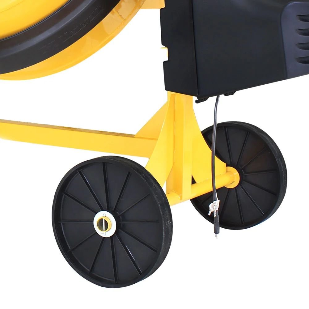 Betoneira com estrutura feita de tambor estampado em chapa de aço especial com duas pás misturadas, pintura eletrostática de alta resistência a intempéries e componentes em ferro fundido.